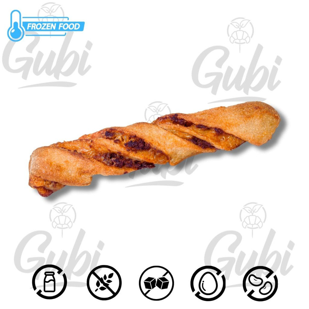 Gubi lisztkeverék (barnarizs liszt, tápióka keményítő, bambuszrostliszt, kölesliszt, aranylenmagliszt, útifűmaghéjliszt), sütőpor, vegán vaj (növényi zsírok és olajok, víz, só, citromsav, béta karotin), só, víz, borecet, paradicsomszósz, kolbász (só, bors, paprika, kömény, fokhagyma, sertéshús, sertészsiradék), vegán sajt (ivóvíz, burgonya és kukorciakeményítő, só, E202, E330, kókuszzsír, E160a), olívaolaj